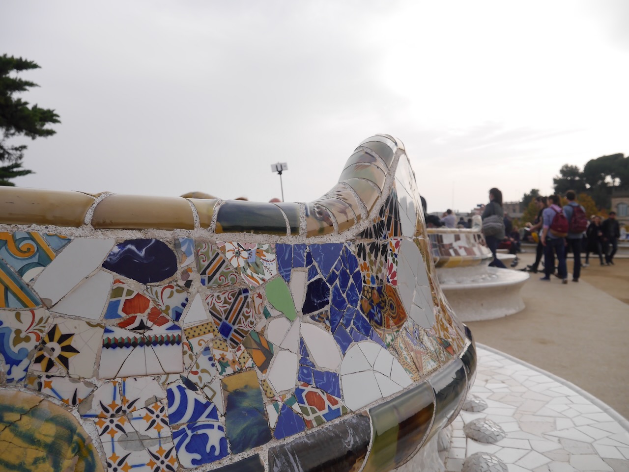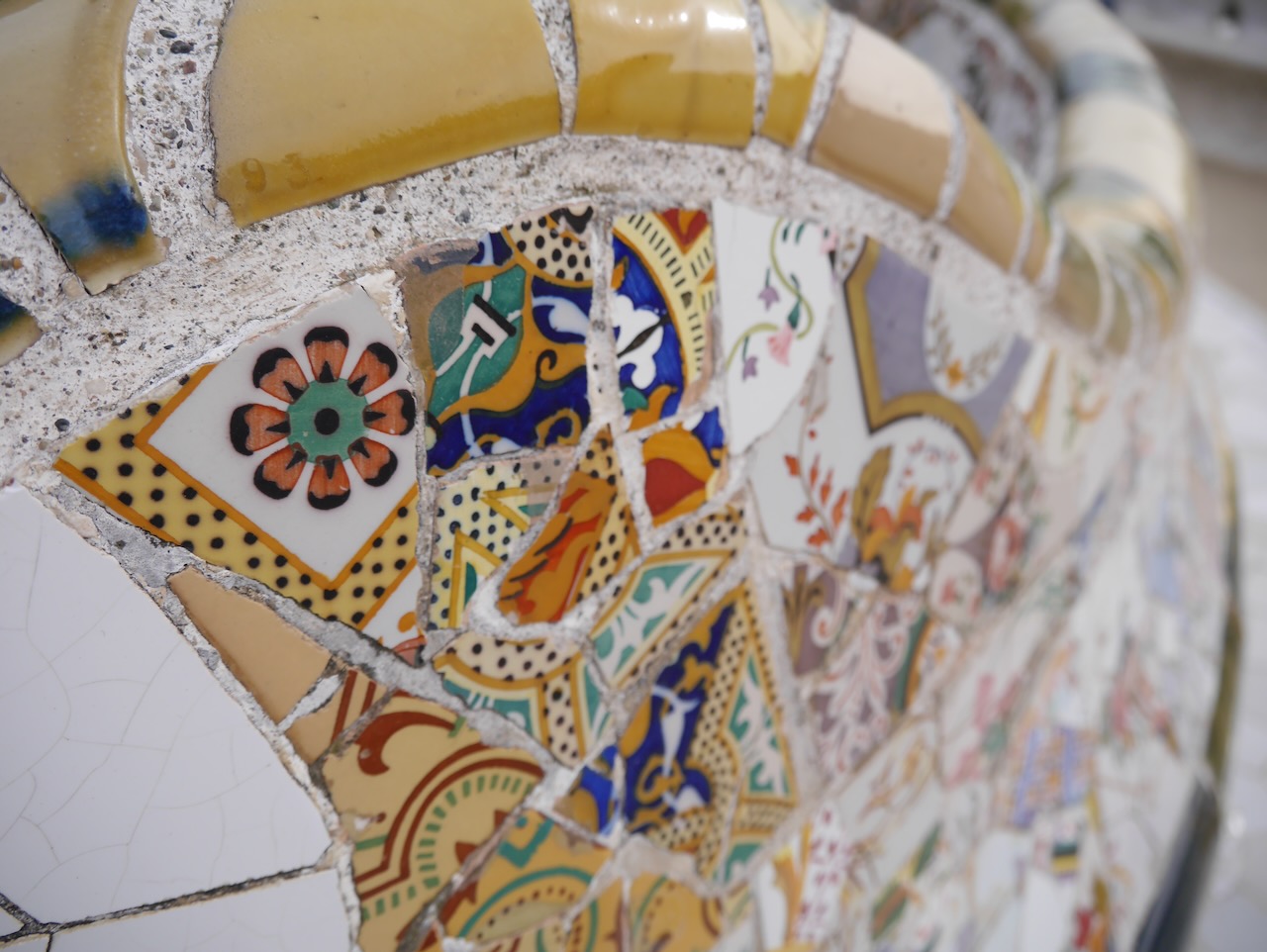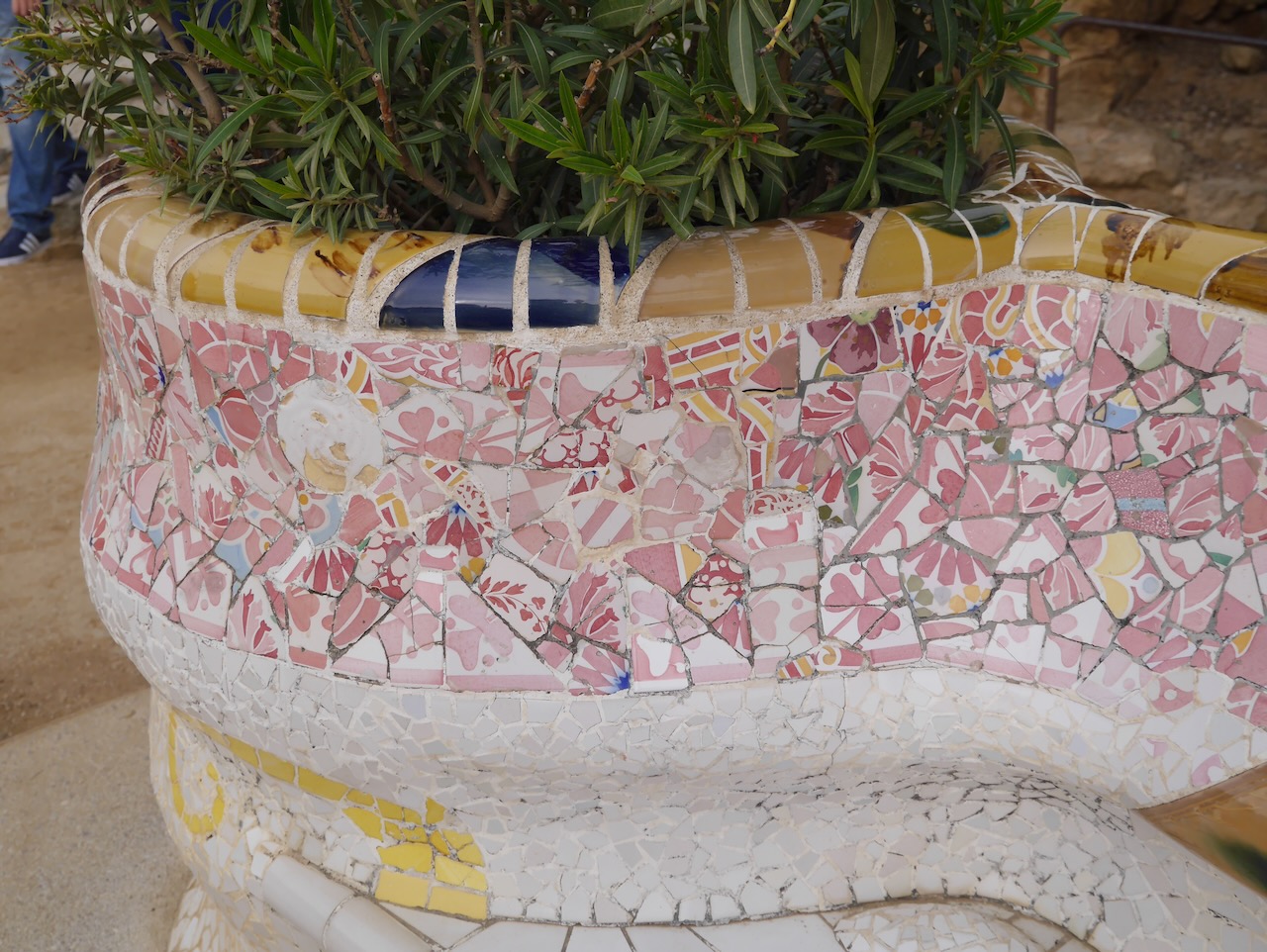 ベンチにはぱっと目を引く美しいモザイク。タイルを一旦細かく砕いた物を建造物の表面に再び装飾として貼り付けたもので、カタルーニャ語で「トレンカディス」(破砕タイルという意味)と言います。