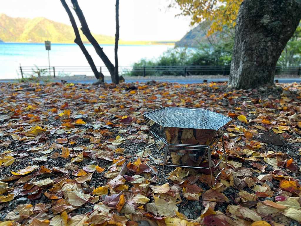 黄葉と落ち葉の絨毯が綺麗。目の前には本栖湖。