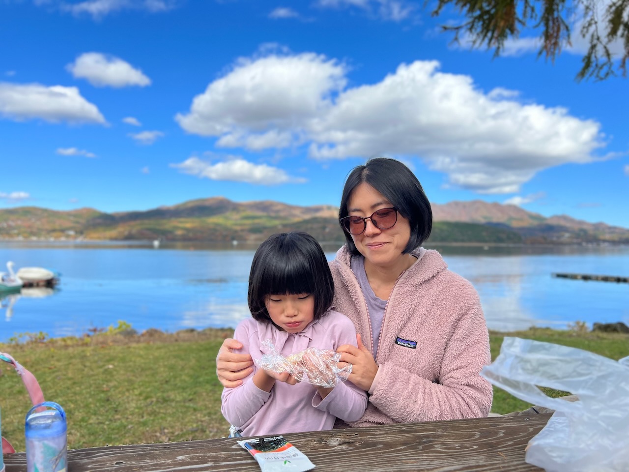 湖畔でピクニックランチ。朝握ったおにぎりをいただきます。お昼ご飯にひとり3個、夜ご飯にひとり2個分おにぎりを握ったのですが、めいさんはお昼ご飯におにぎりを4個も食べました。