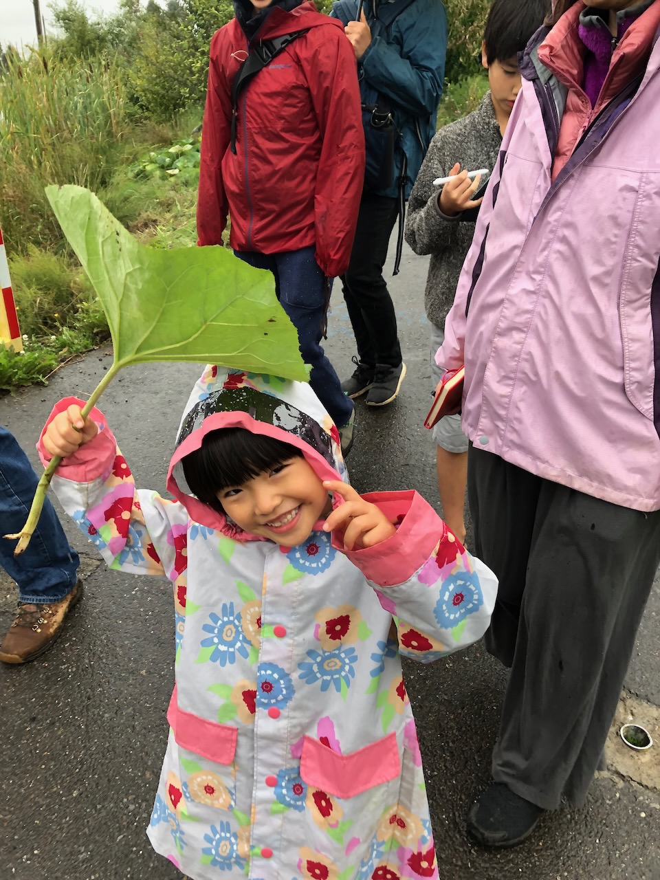 小雨がぱらついていたので、めいさんは大きな葉っぱを傘がわりにしています。トトロみたい。