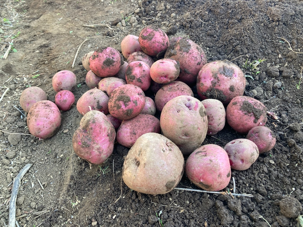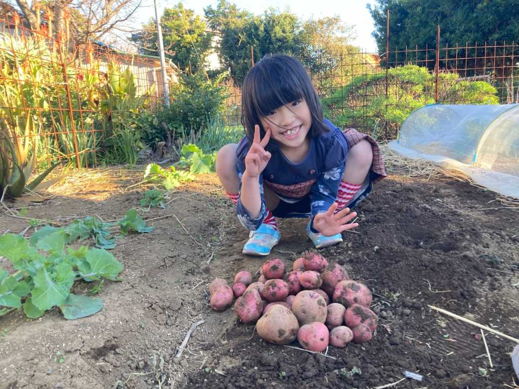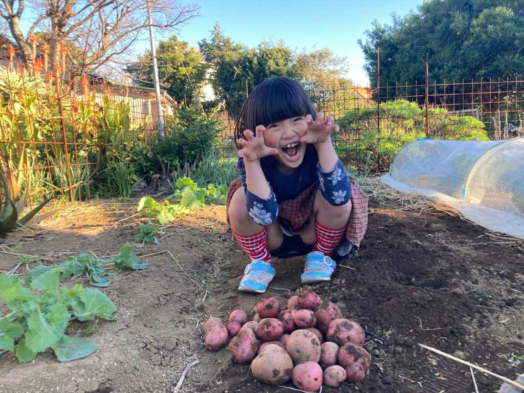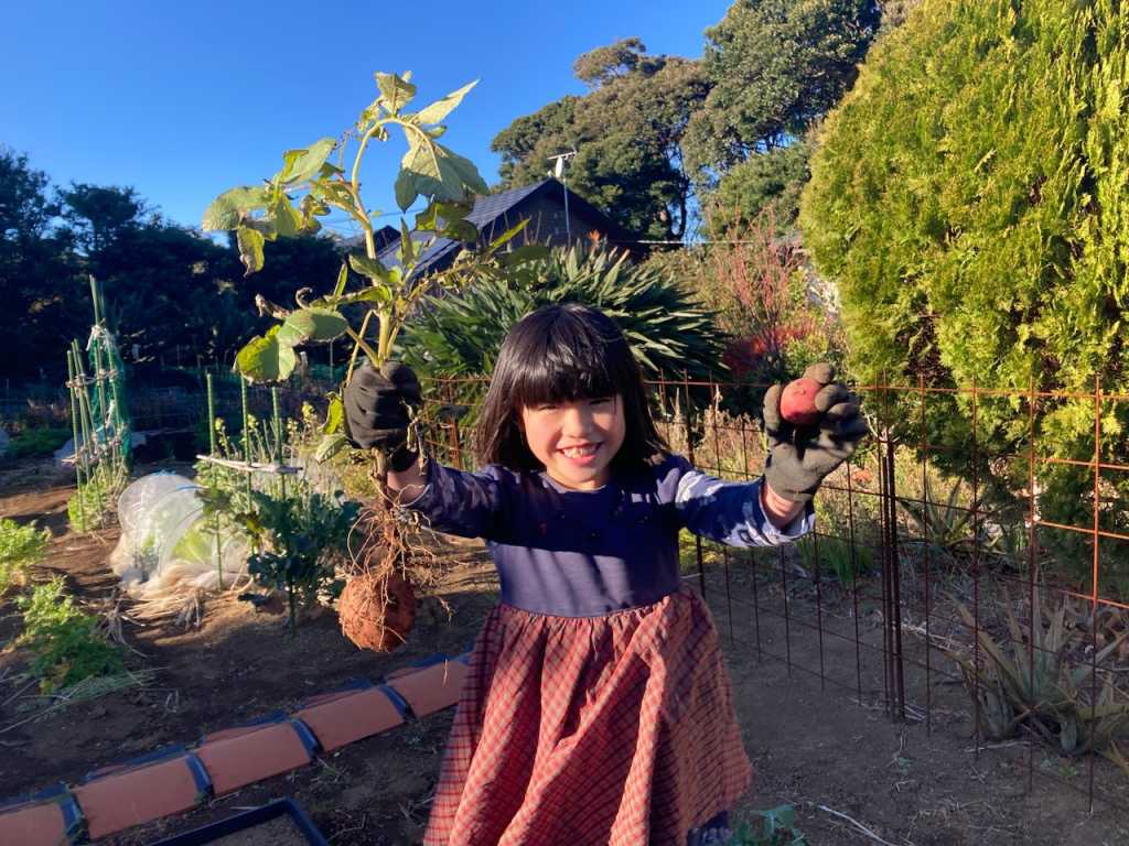 昨日12/25、めいさんと一緒に畑のじゃがいも (アンデスレッド) の収穫をしました。