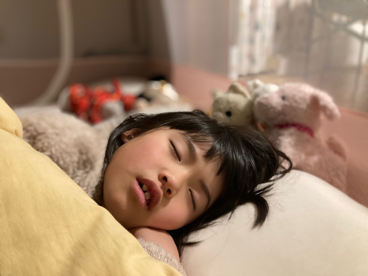めいさんのすやすや寝顔が可愛らしい。ぬいぐるみさんたちに囲まれて眠っています(^^)
