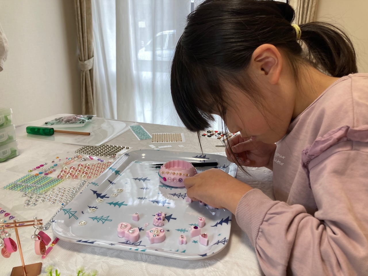 型抜きした後はシールでデコレーションをします。きらきらの可愛らしいシールがたくさんあってめいさんは「 かわいい !」と選ぶのが楽しそうでした。ずっと真剣な表情で作業をしていました。