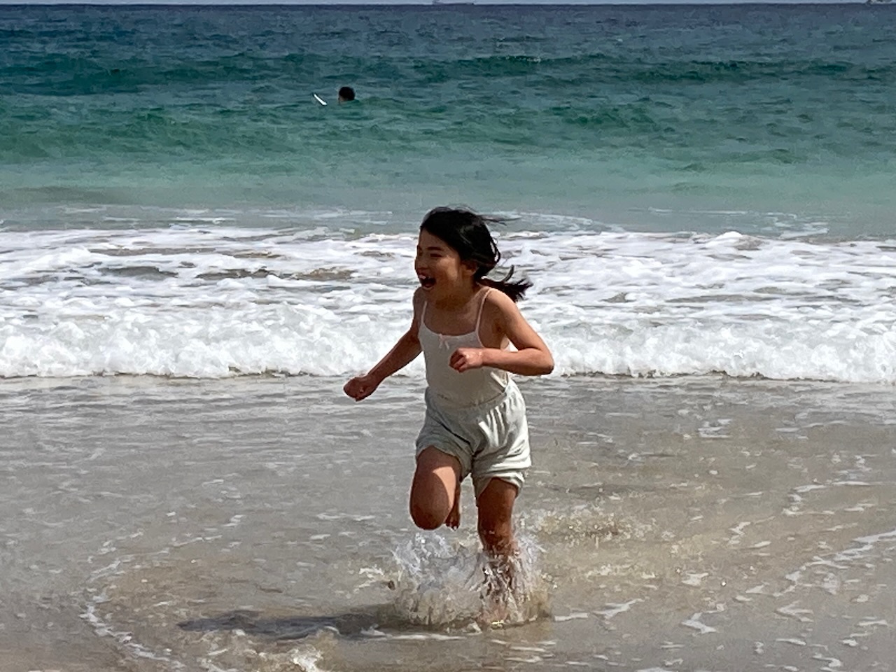 海に入るにはまだ少し肌寒かったけれど、お洋服を脱いで波遊びもしました。めいさんは久しぶりの波遊びにきゃっきゃっ言っていました。