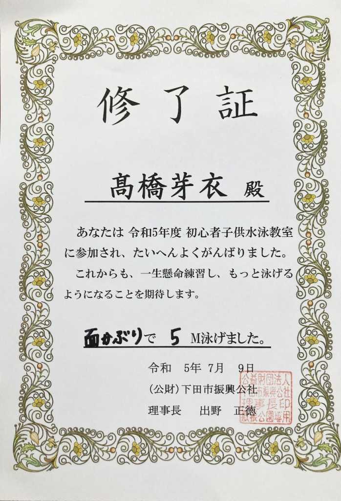 水泳教室 めいさん日記 2023.07.09 今日は全6回通った水泳教室の最終日でした。修了書をもらってきました。水泳教室に通う前は水にぷかぷか浮かぶだけで、前に進むことはできなかったけれど、面かぶりで5m 泳ぐことができるようになりました。頑張ったね、めいさん。 コメント