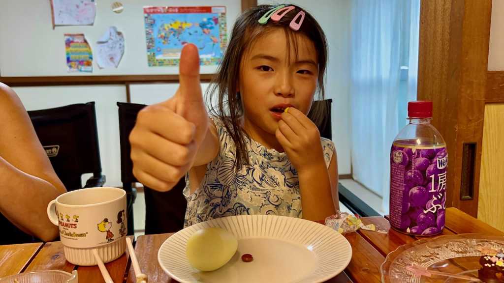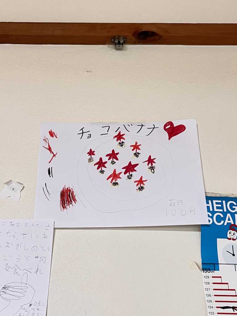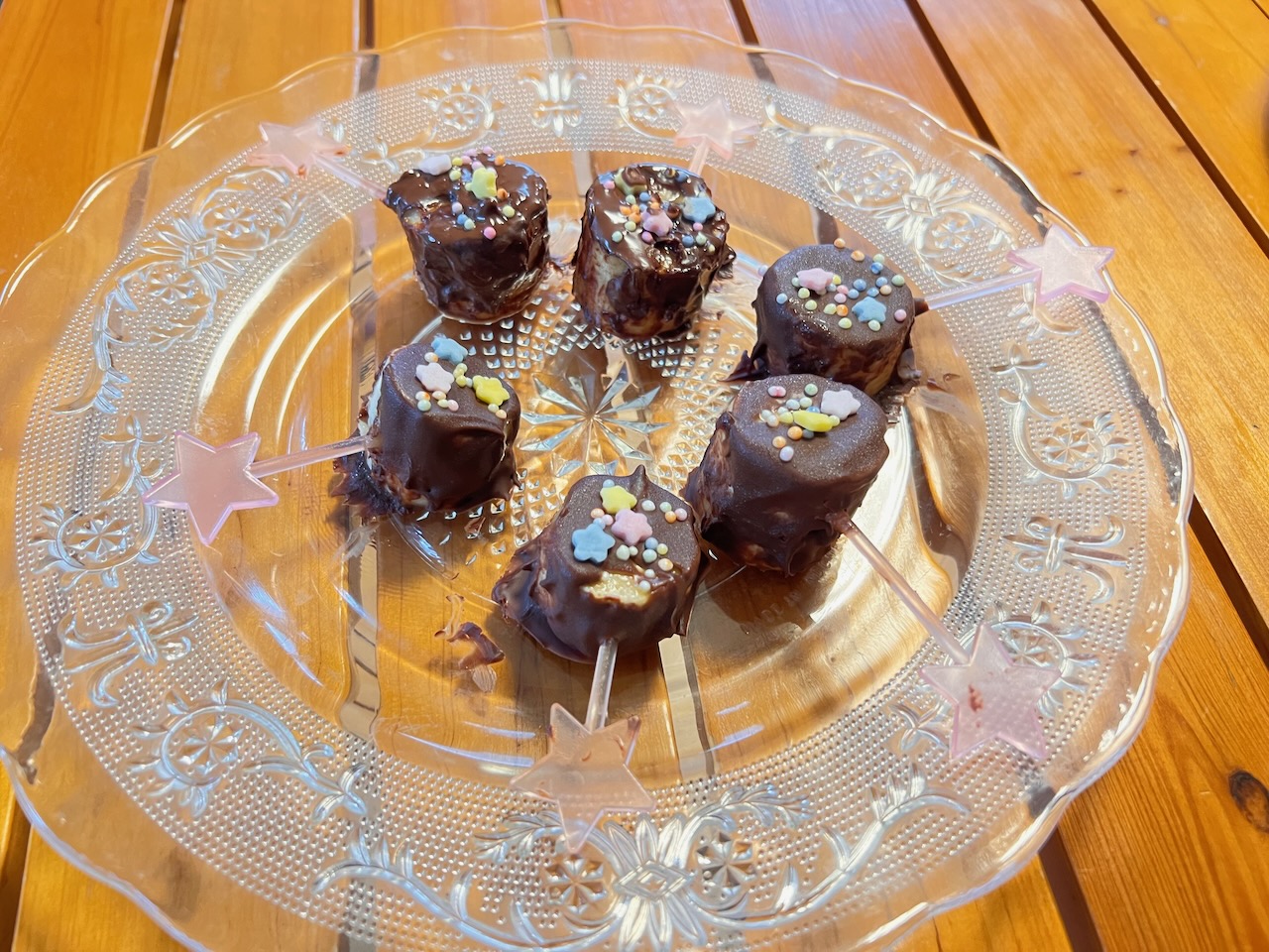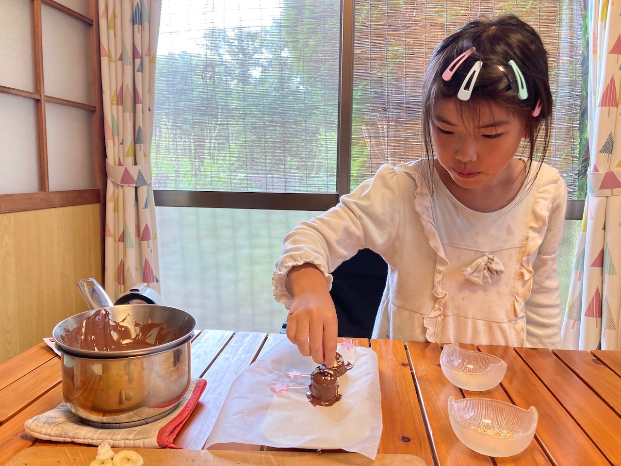 昨日の夕方ここ数年恒例になってきているおうち夏祭りを開催しました。今年もめいさんがチョコバナナを作ってくれました。
