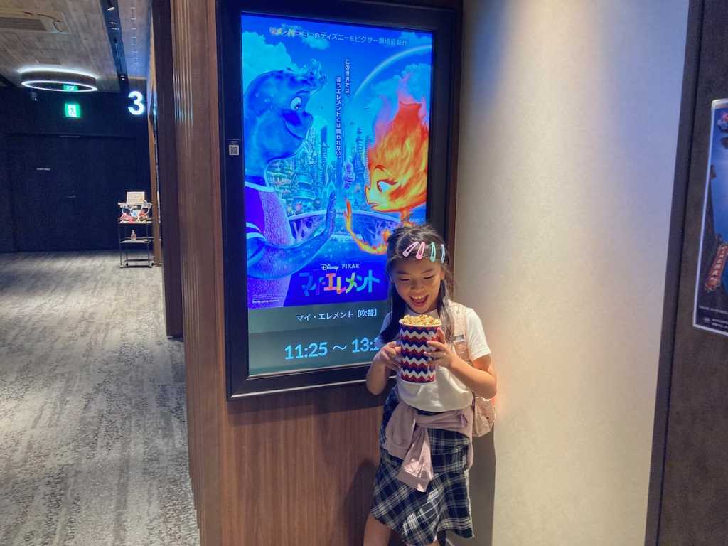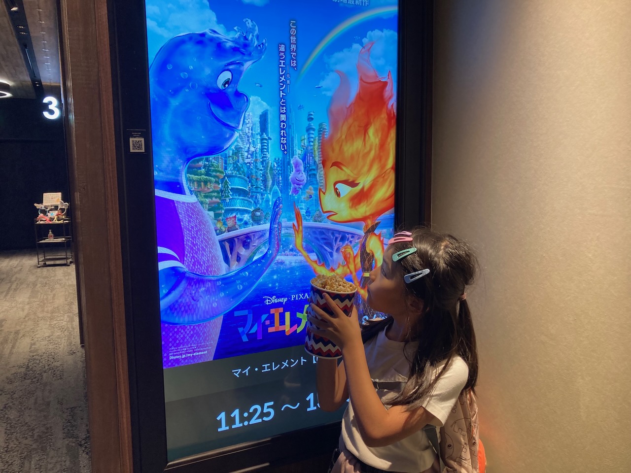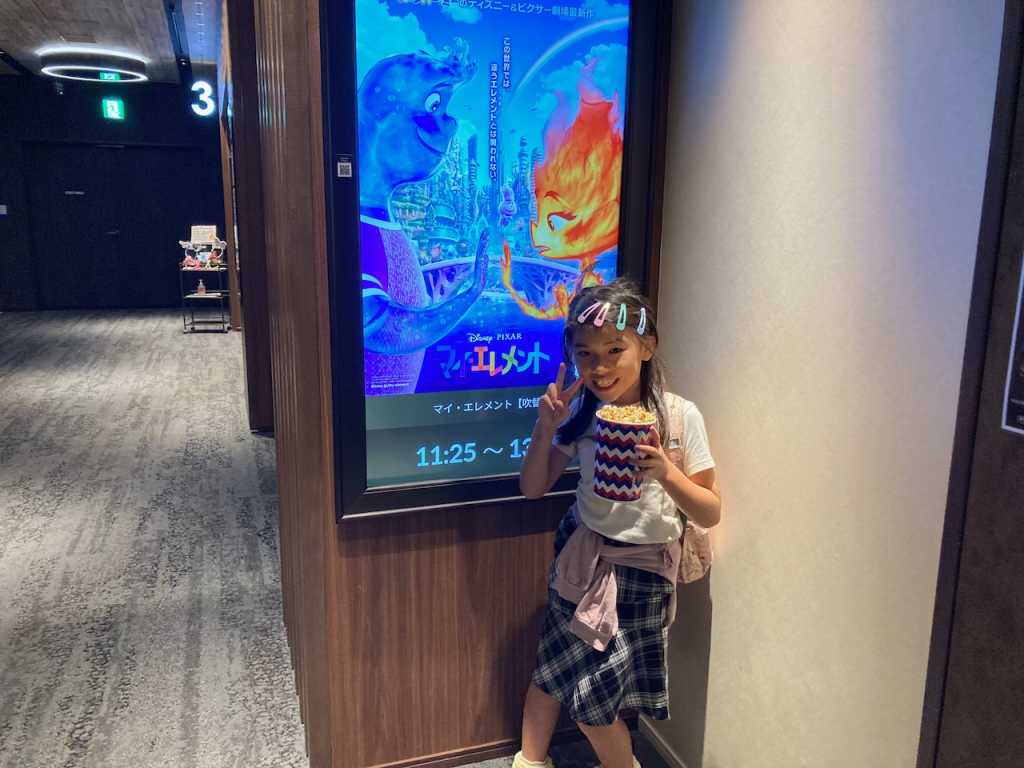 「映画といえばポップコーンでしょ。」とめいさん。マイ・エレメントという映画を観てきました。めいさんは映画を観終わった後、「最初は楽しくて、最後は感動した。」と言っていました。