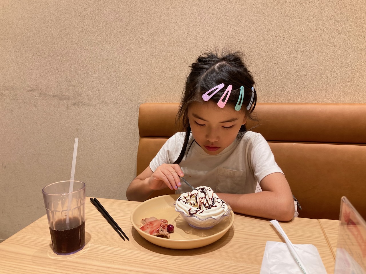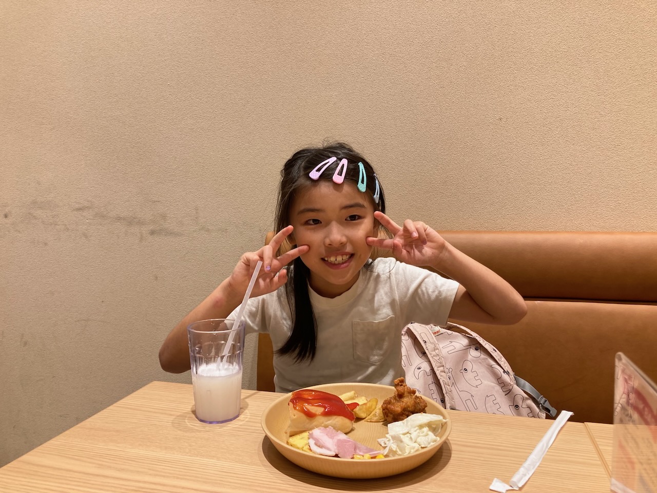 お昼ご飯はめいさんのご希望でビュッフェスタイルのレストランで頂きました。自分で好きなお料理を選んで「いただきます」。