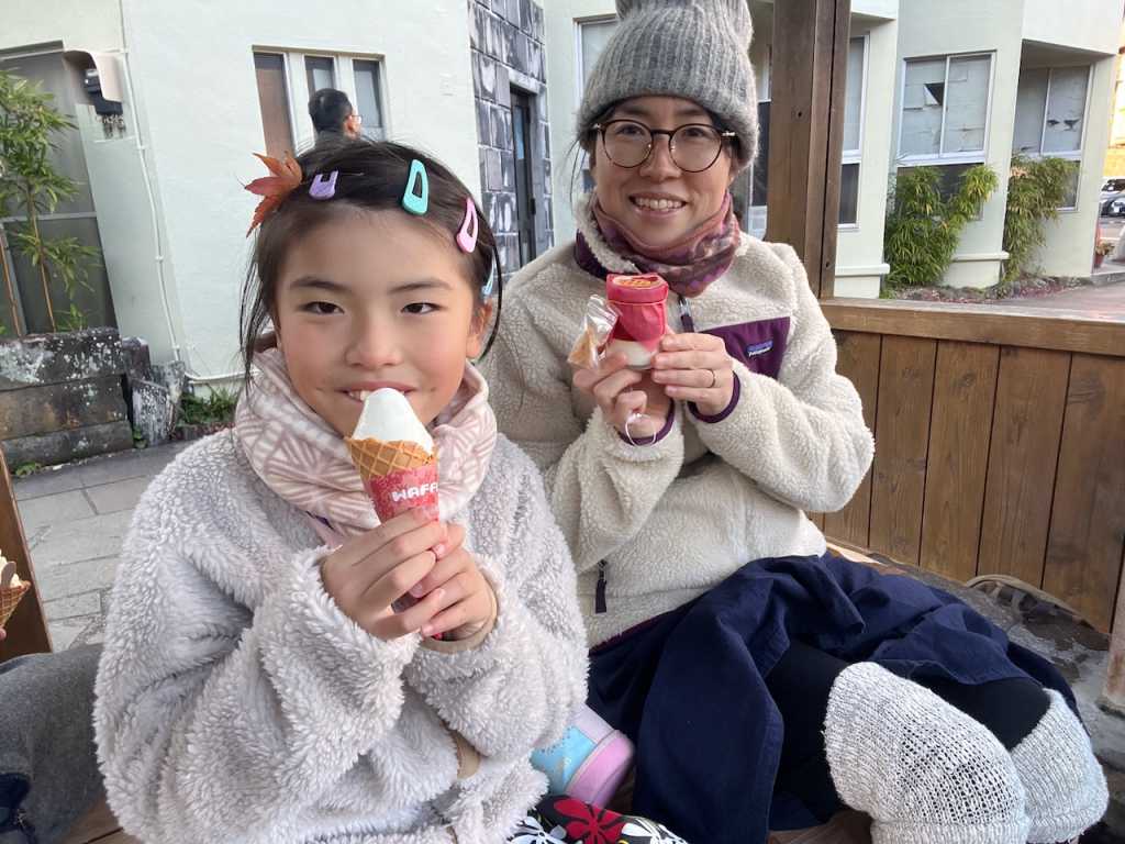 めいさんは今身長127cm くらいです。どんどん大きくなっていきますね。めいさんは温泉もソフトクリームも大好きなので最高の組み合わせでした(^^)