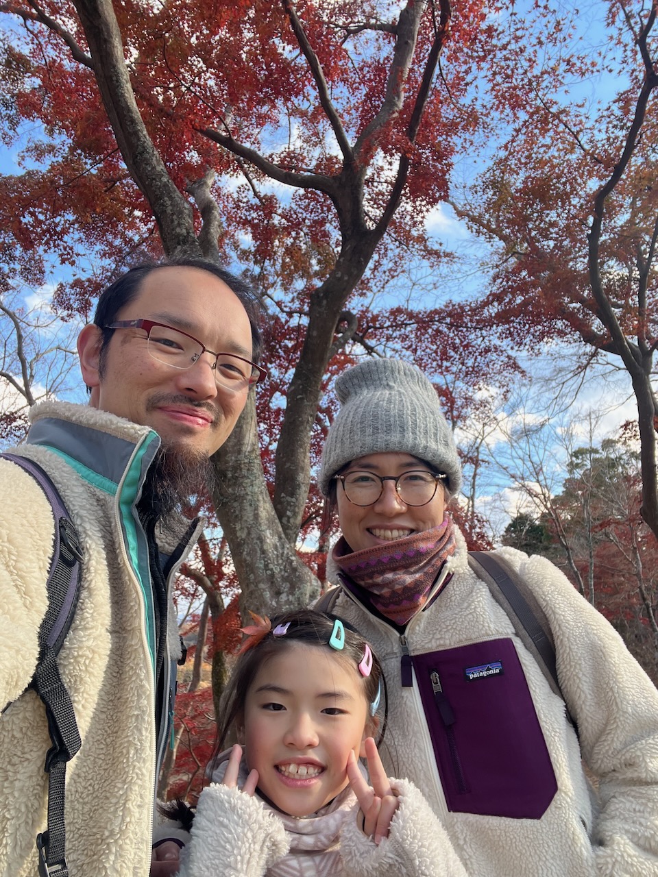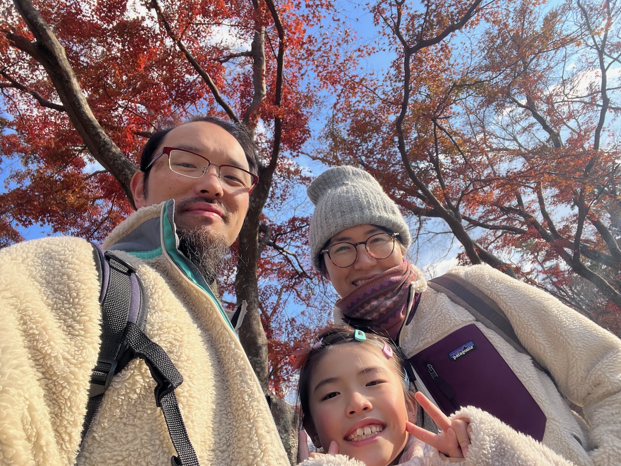 綺麗な紅葉をバックに3人で記念撮影。