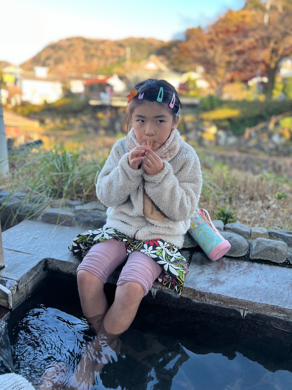 めいさんが楽しみにしていた足湯につかりながらソフトクリームを食べる時間です。めいさんは梅の季節に修善寺にやってきたときも足湯につかりながらソフトクリームを堪能していました。