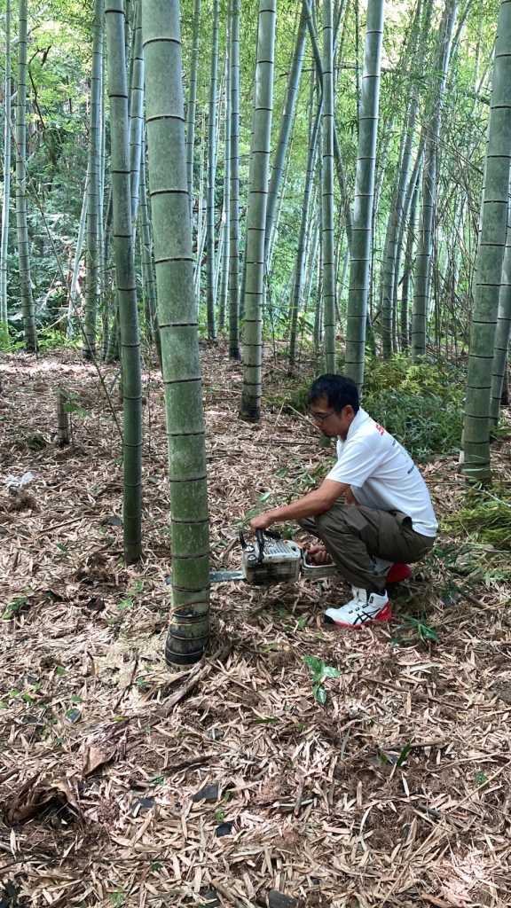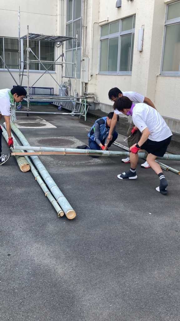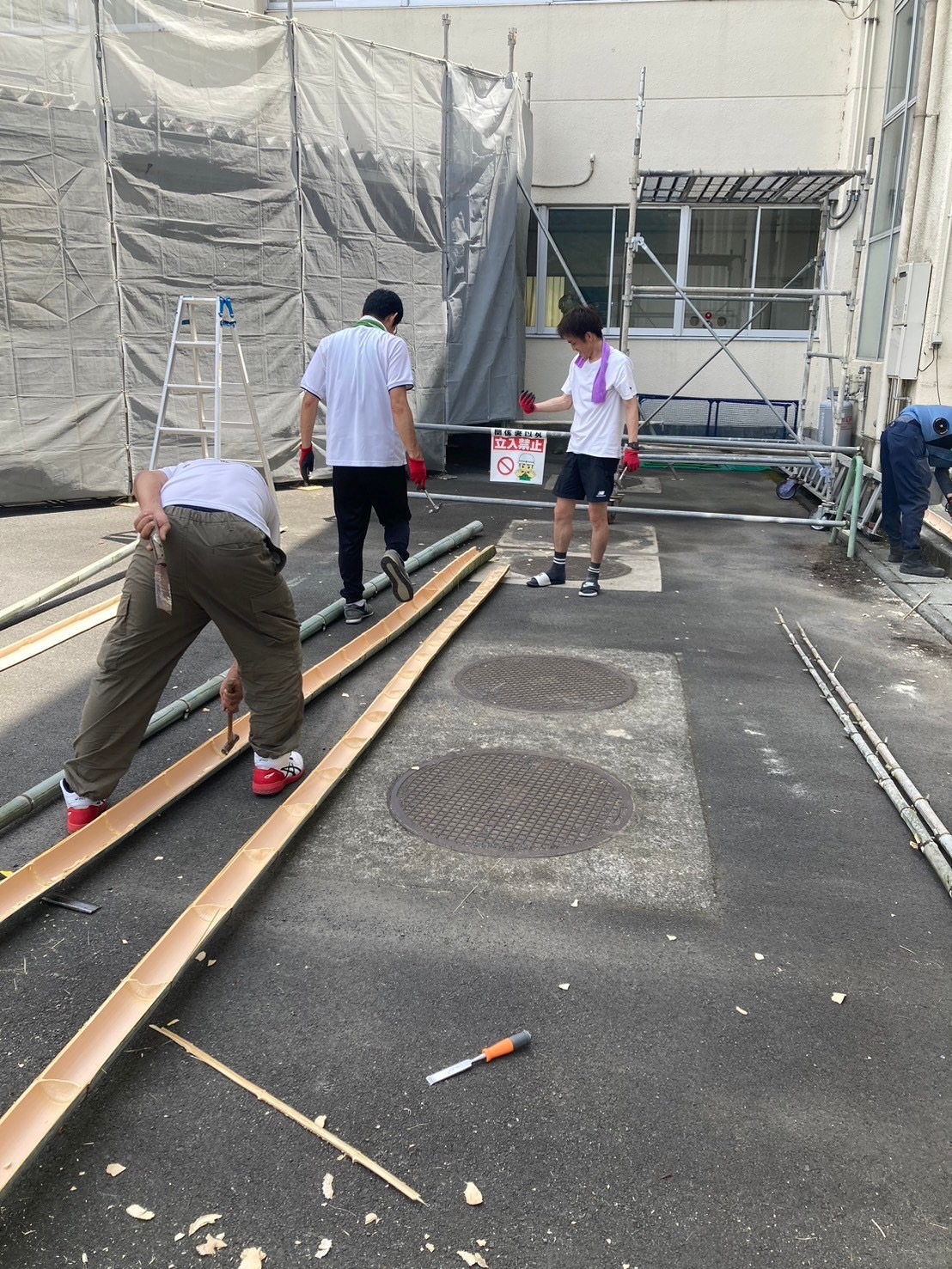 7/27(土)、パパさんたちが山へ竹を取りに行って、割って、節を取って、流しそうめんの本体を作りました。