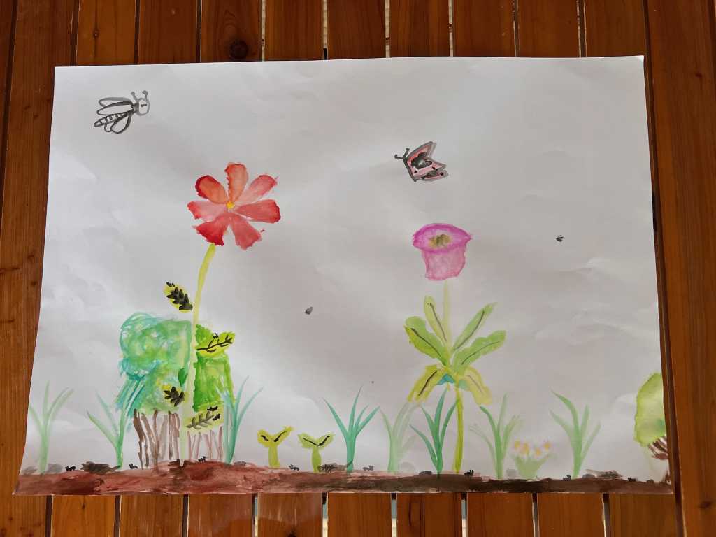 お家にあるお花を書いてみました。右のお花が私のおうちのお花です。でも花の所はオリジナルに書いてみました。葉だけ同じように書いてみました。そして左にあるお花は全部オリジナルに書きました。花びらの先は色をこく書いて、花びらの中心はうすく書きました。あと私の家のおにわのお花の葉にありがいたので葉にありを書いてみました。あと私の家のお庭にはトンボやちょうやかがいるので書きました。地面には落ち葉やありやだんご虫や石を書きました。あと左のお花の後ろに小さい木を書きました。お花をきれいに書けてよかったです。