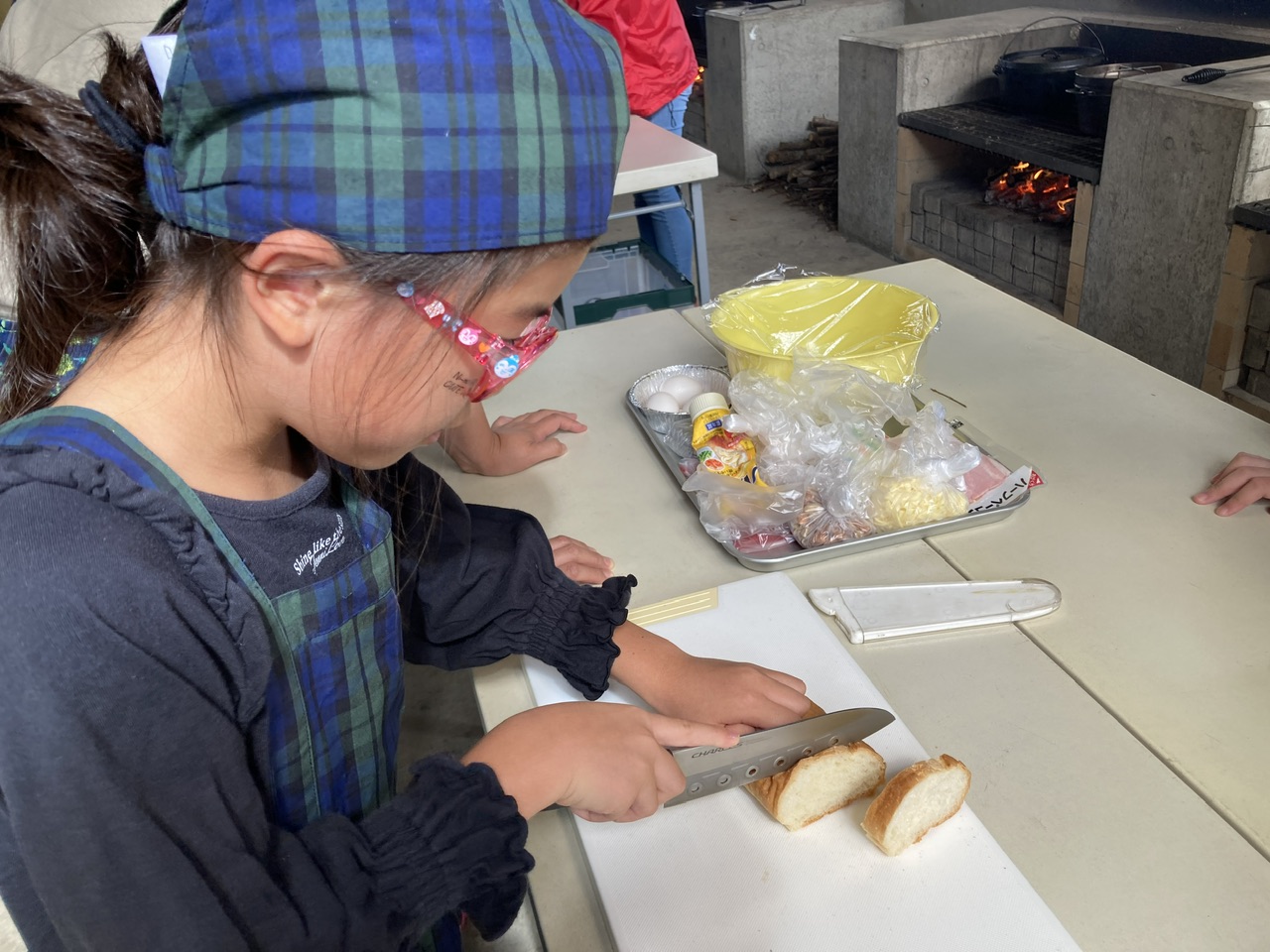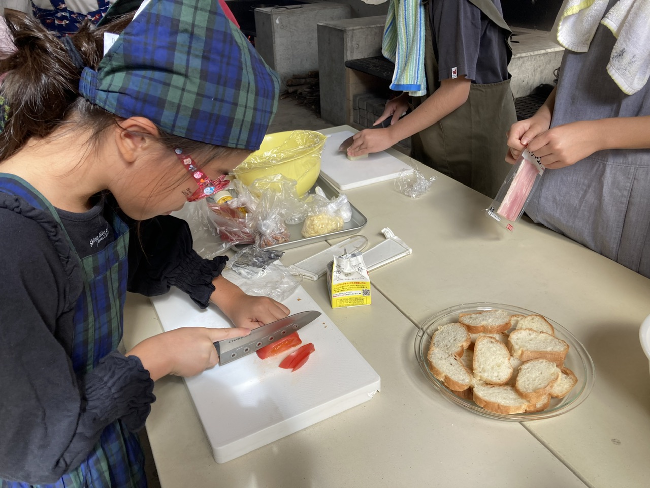 まずはパングラタン作り。パンや野菜をカット。