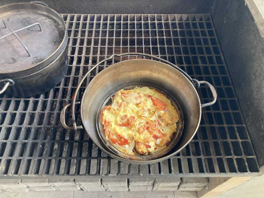 チーズやベーコンもトッピングして、ダッチオーブンへ。
