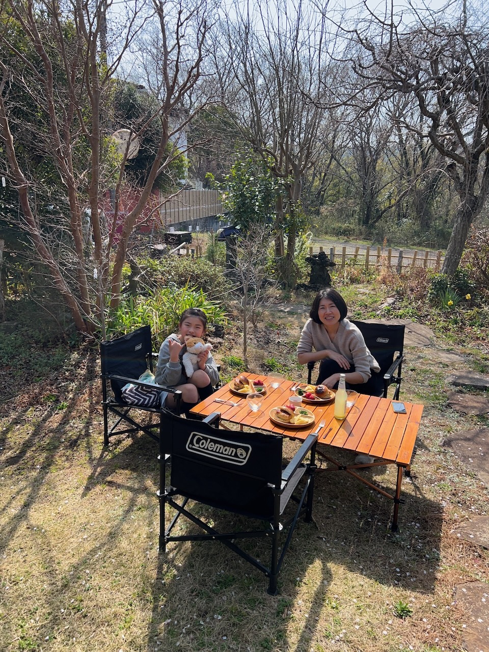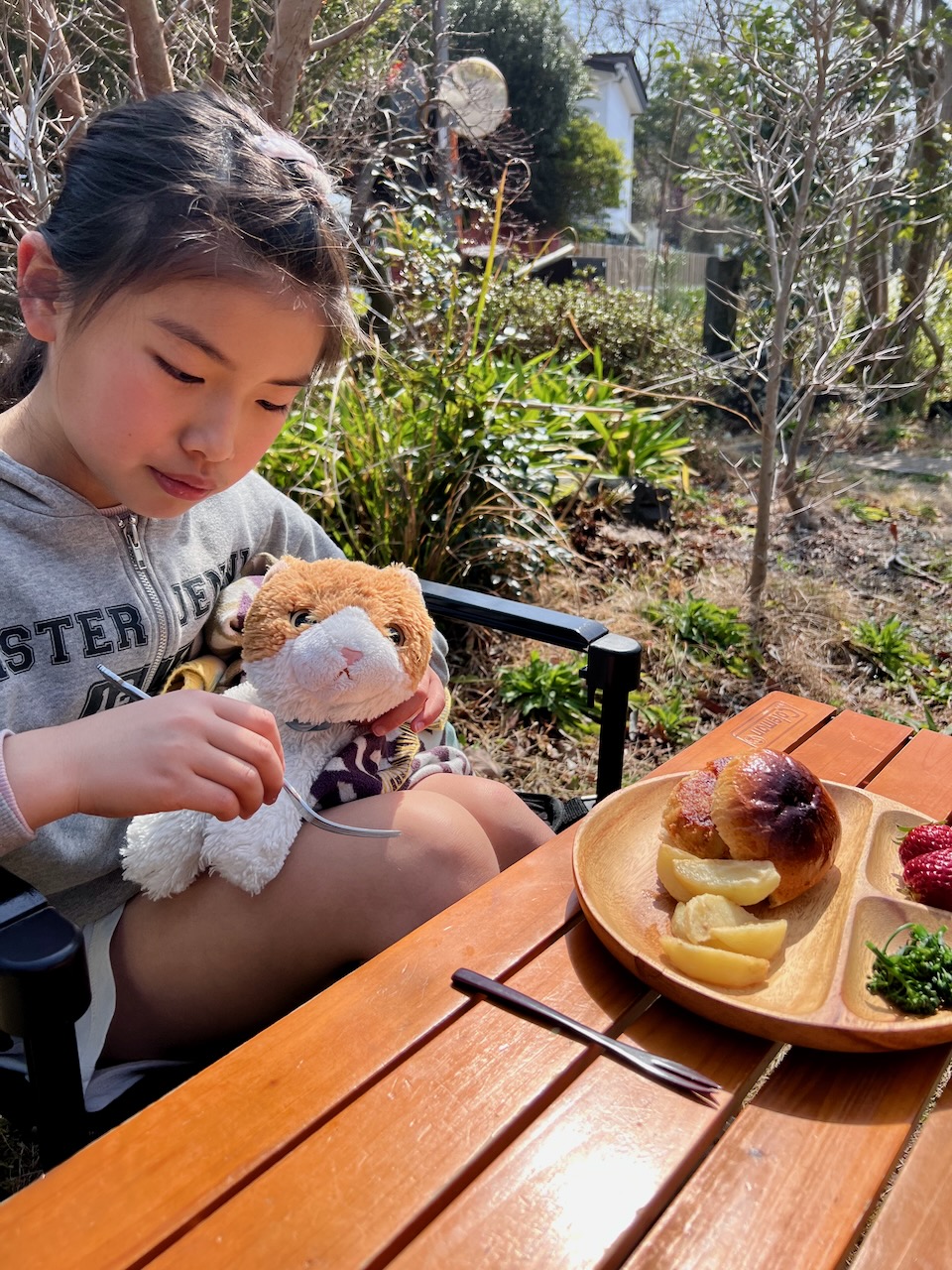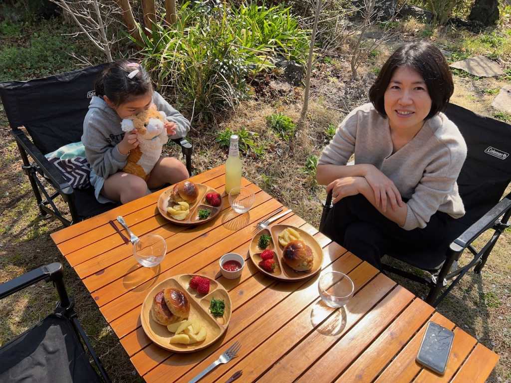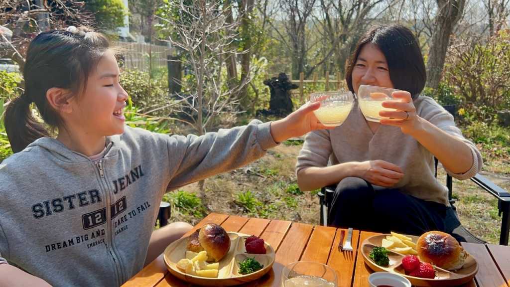 お庭でお花見ピクニック めいさん日記 2025.03.25 3/25(火)、お庭のソメイヨシノが見頃なのでお庭でピクニックをしました。 めいさんはピクニックが大好きなので大喜びで、率先してテーブルや椅子の用意をしてくれました。 お手製コロッケバーガーにフライドポテト、お庭のブロッコリー、静岡産紅ほっぺのランチです。 リモナーターで乾杯。暖かくなってくるとリモナーターが最高です。 猫のポー子ちゃんも一緒にピクニックランチを楽しみました。 コメント