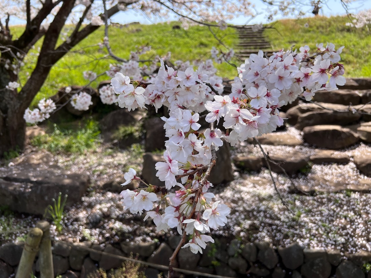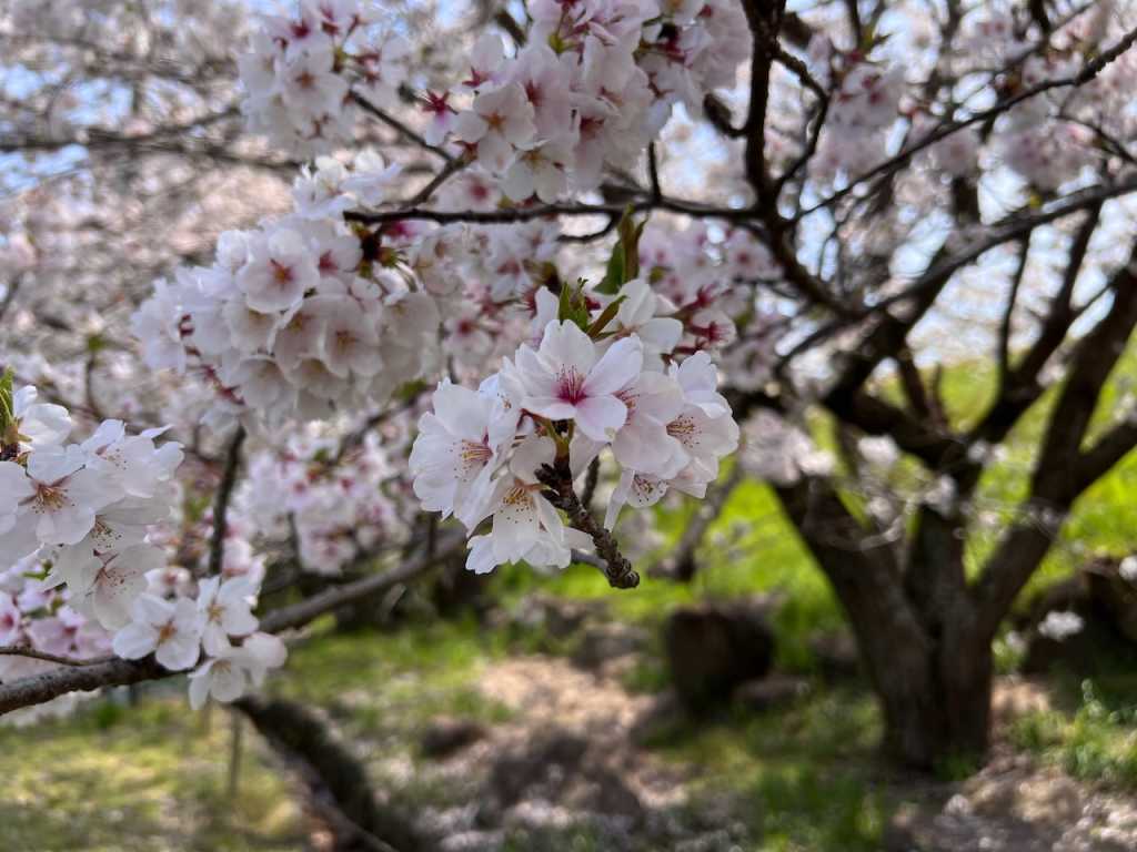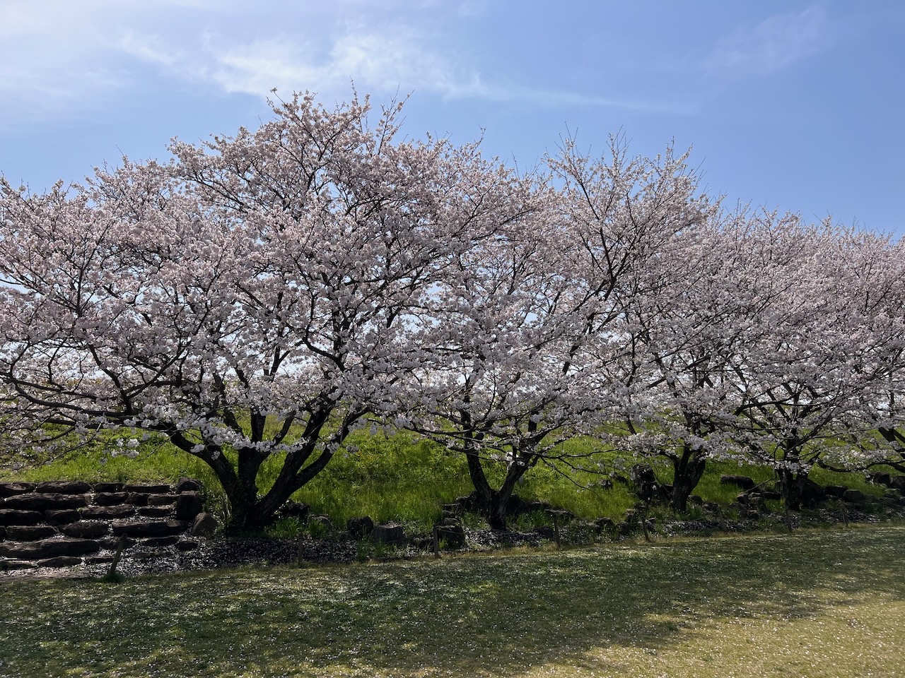 桜の木の下でお花見ピクニックです。この日のお弁当は玉子おにぎりと唐揚げ。