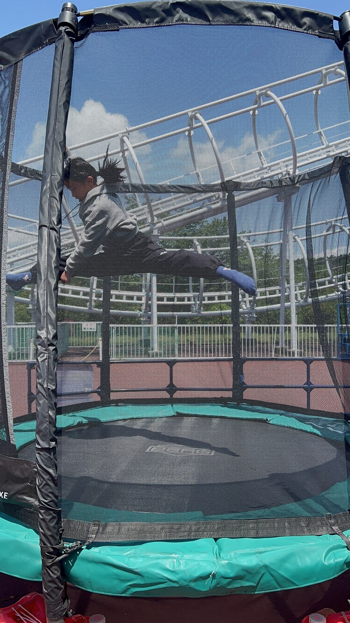 トランポリンでスプリッツ(バレエの前後開脚)をしています。
