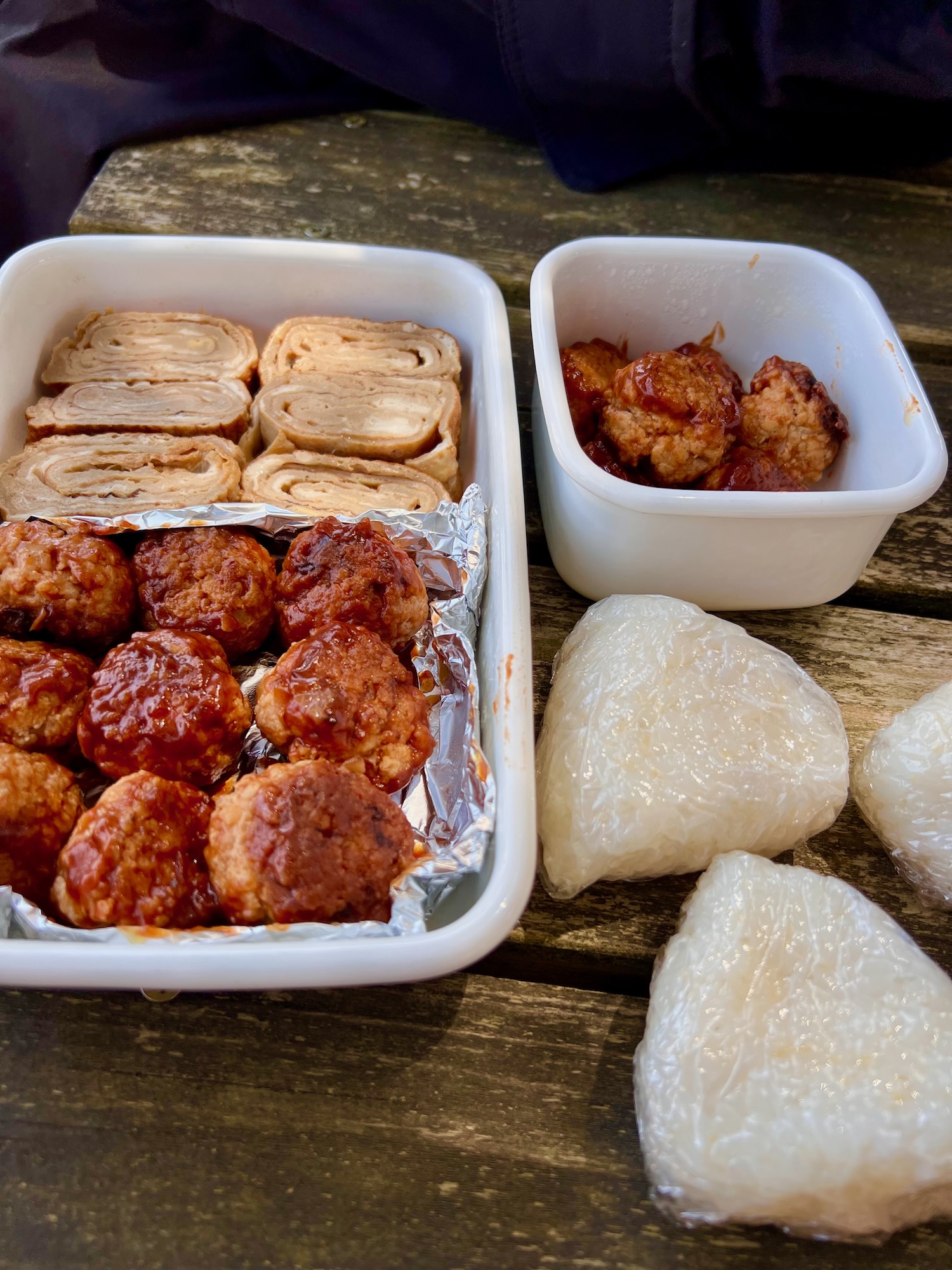 豆腐ミートボール、玉子焼き、おにぎり。