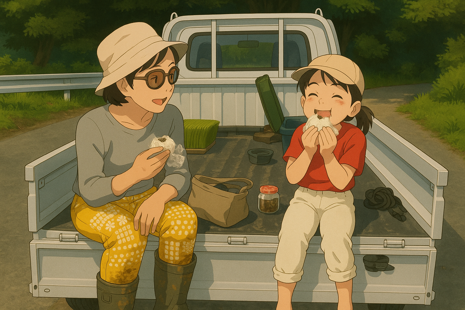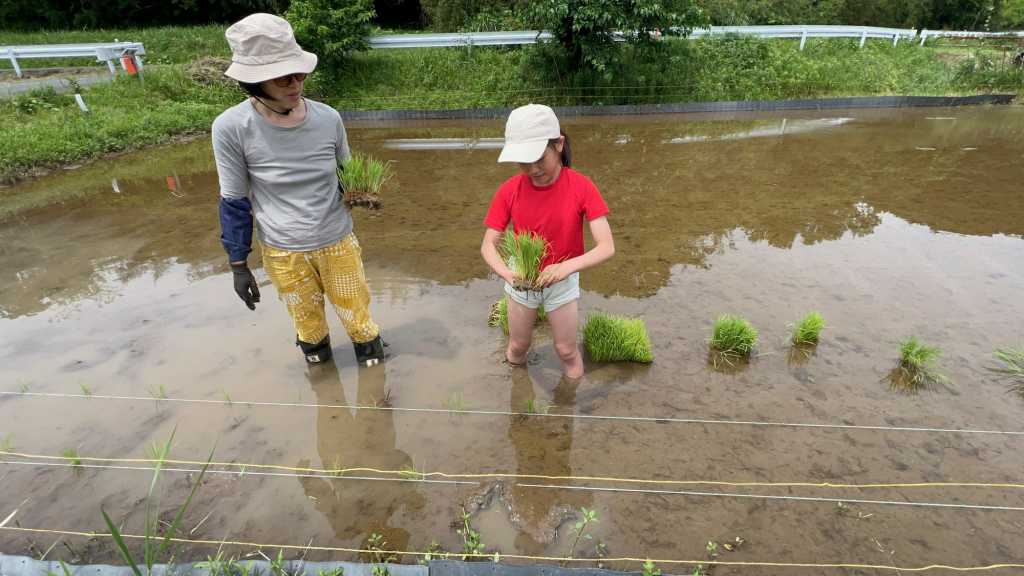 7年前に田植え体験したとき、めいさんは田んぼの中に入るだけでも怖がっていましたが、ずいぶん成長しました。