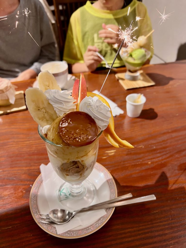 こうちゃんは花火付きのおりじなるプリンパフェ。