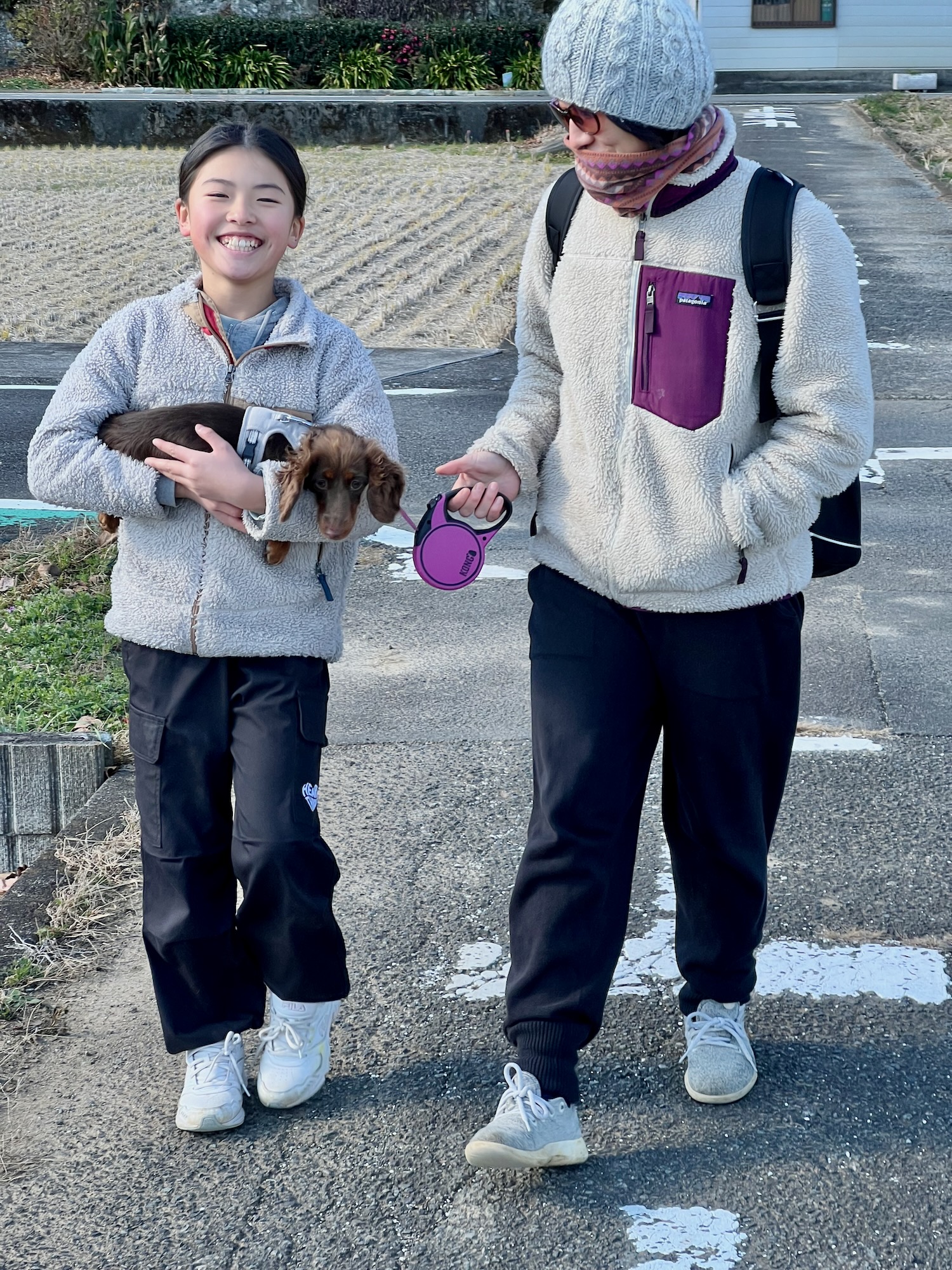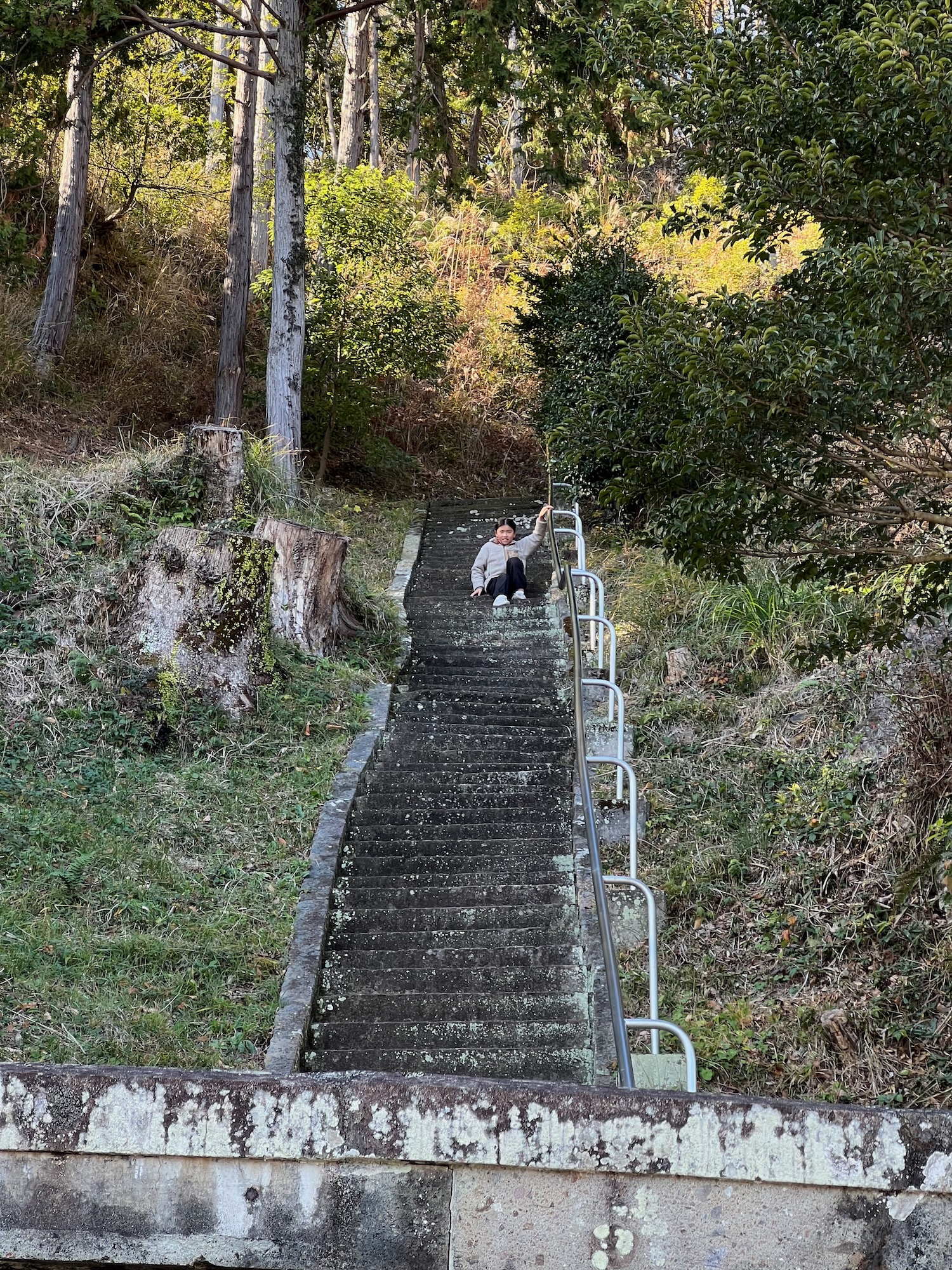 チョコちゃんを抱っこして階段を降りていたら、めいさんも抱っこしてと階段に座り込んでいました。こうちゃんがもう一度階段を上って、抱っこは難しいので手をつないで一緒に降りました。