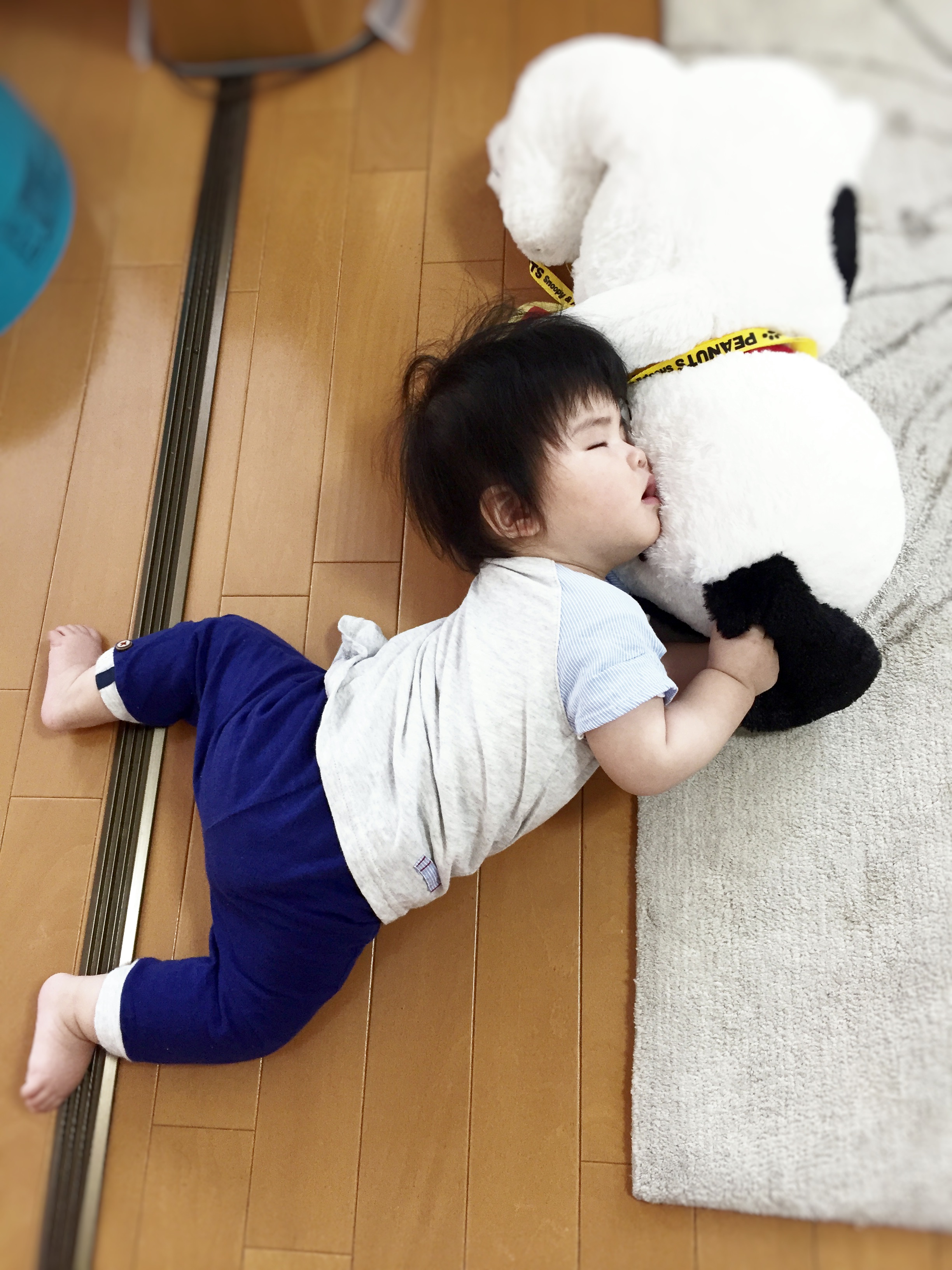 遊び疲れて途中で撃沈。ちなみに昨日保育園で初めてお外にお散歩に行ったそうです。4人乗りのベビーカーにお友達と一緒に乗って楽しそうにまわりをキョロキョロ。お散歩から帰ってくると音楽に合わせてつかまり立ちで腰をフリフリ。たくさん遊んで疲れて爆睡...